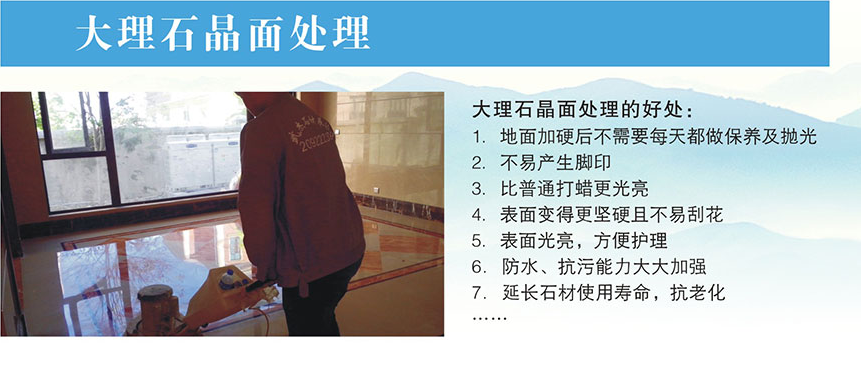 4、結晶硬化處理石材在使用若干年后,表面會老化,嚴重影響美觀,晶面硬化處理就是經過粉磨劑研磨,使化學藥劑與石材中的鈣成分發生化學反應,在石材表面形成一層新的晶化物質,防止污漬滲入石材內層,增強抗磨性,使石材折射出天然的光澤,以達到一定的硬度和亮度。